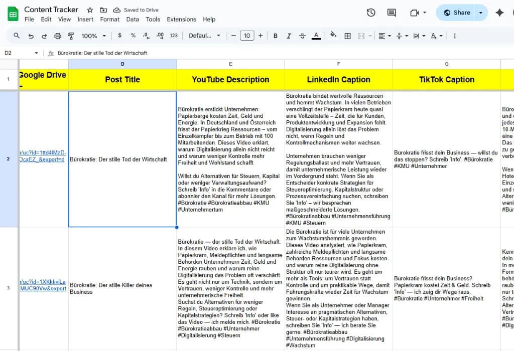 Der Workflow zentralisiert die Beitragserstellung, aggregiert Inhalte und verteilt sie automatisch mit passender Zeitplanung. Gleichzeitig werden alle relevanten Informationen in Google Sheets und Google Drive für weitere Auswertungen und Berichte gespeichert und aktualisiert.
